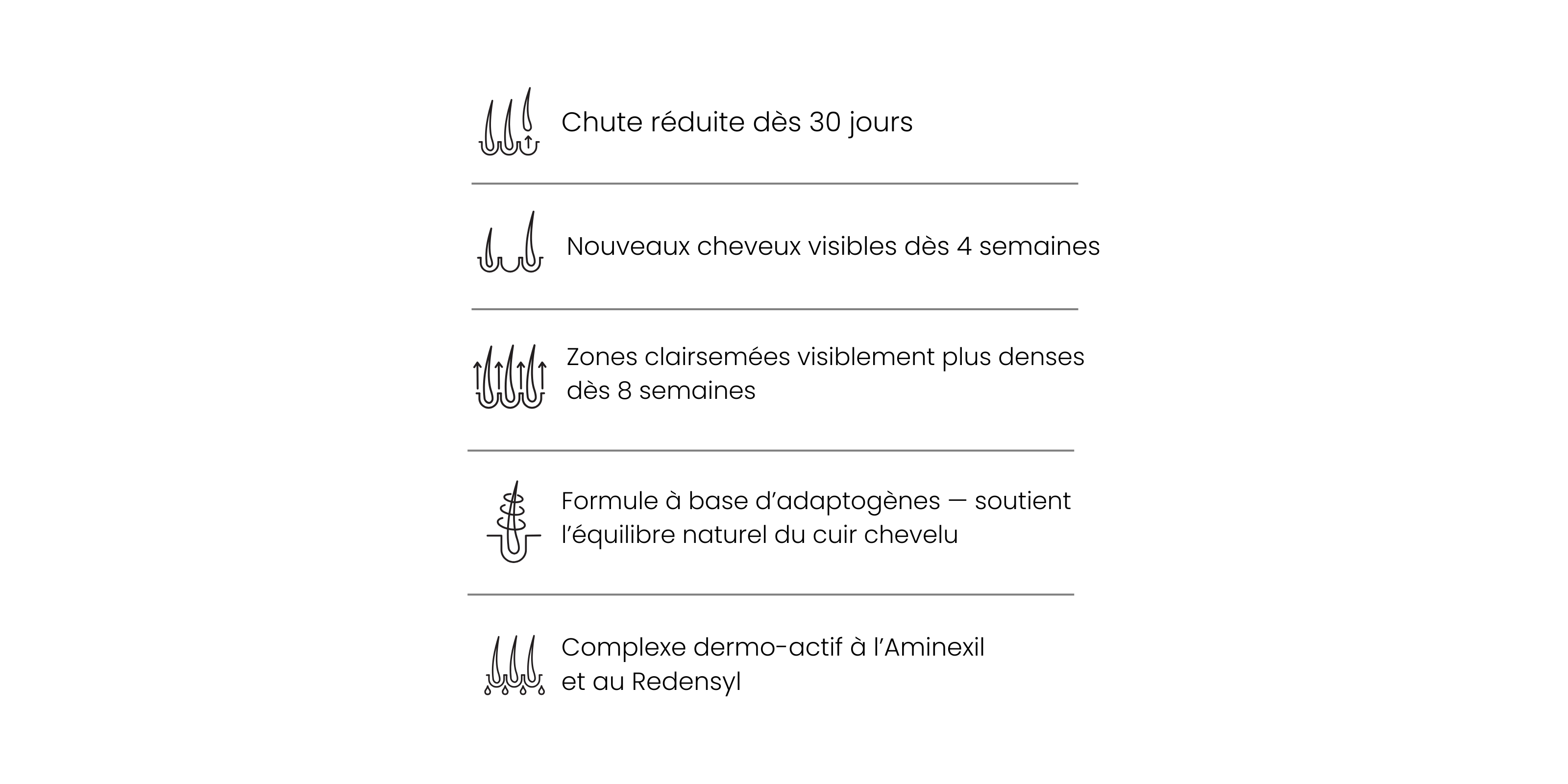 Les premières améliorations apparaissent généralement entre 2 et 4 semaines (moins de chute, petits cheveux). Les résultats plus visibles sur la densité arrivent entre 6 et 12 semaines selon les personnes. C’est un processus normal lié au cycle naturel du cheveu.