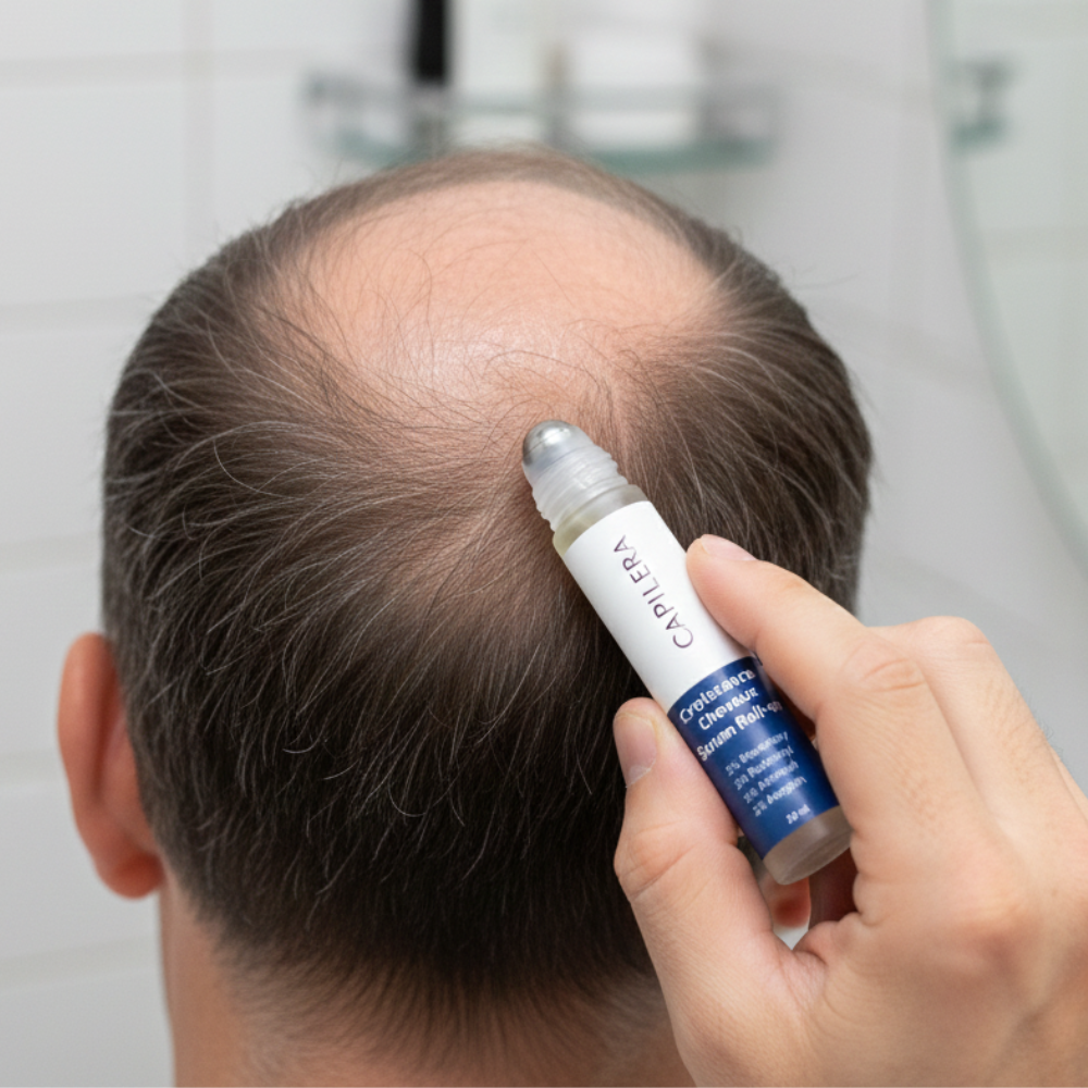 - Faites glisser le roller directement sur le cuir chevelu propre et sec, en ciblant les zones clairsemées ou sujettes à la perte.