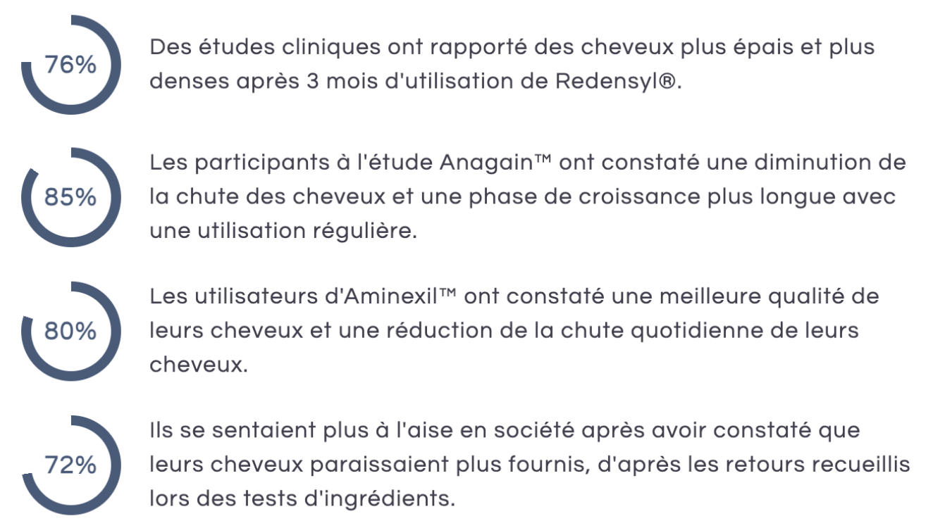 • Redensyl 3% – Réactive les follicules au niveau de la racine pour accélérer la croissance et réduire la chute.