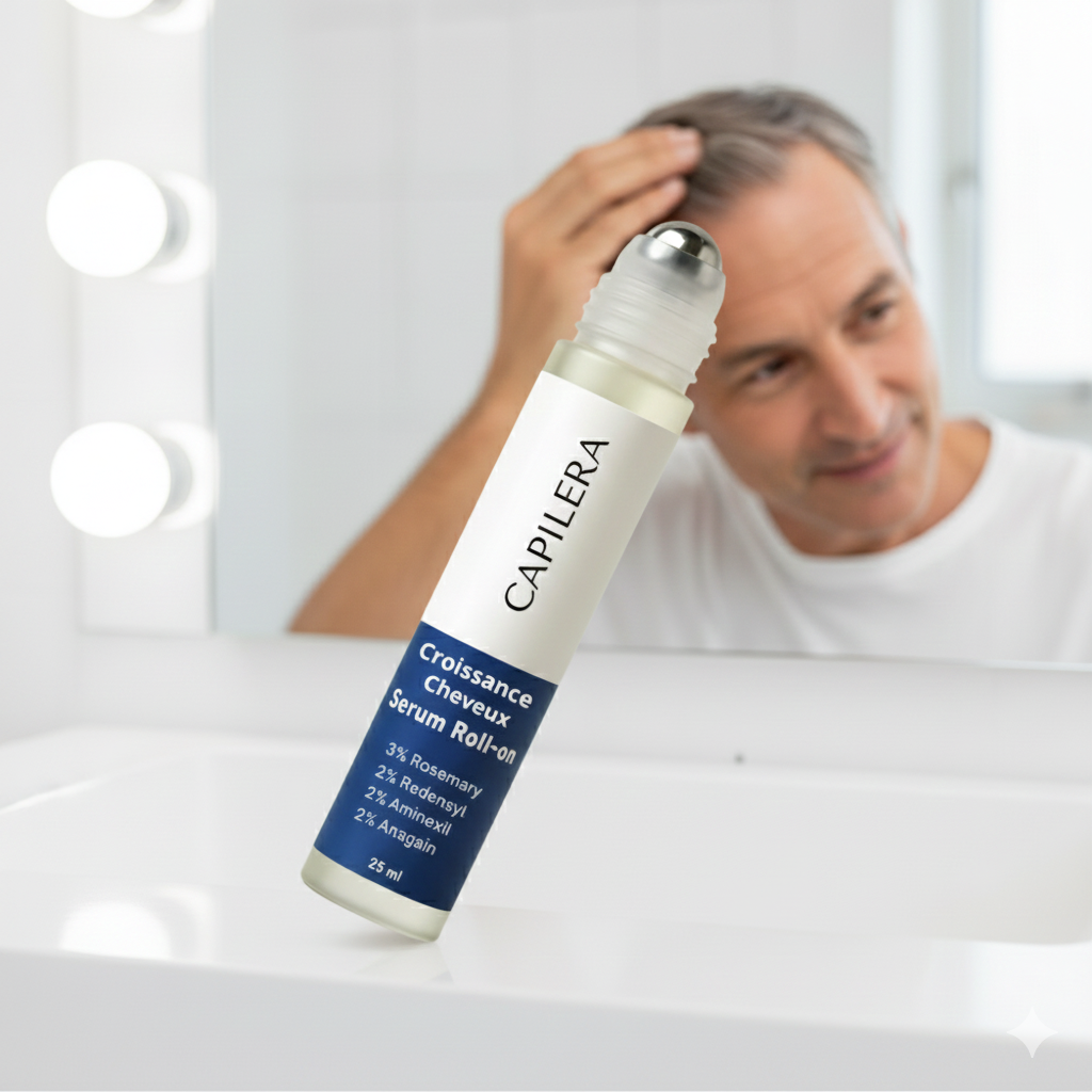 Capilera utilise 4 ingrédients actifs soigneusement étudiés — Redensyl®, Aminexil™, Rosmarino et Anagain™ — dosés avec précision pour agir sur les cheveux clairsemés dès la racine.